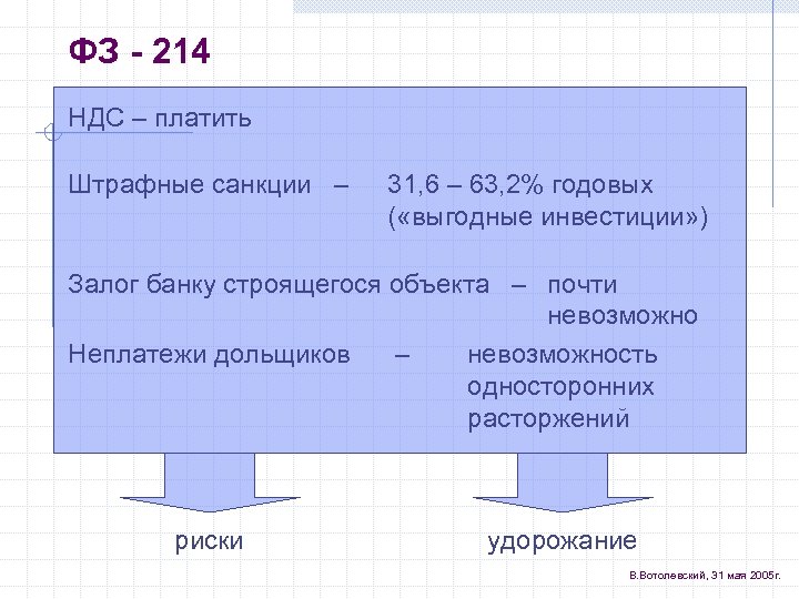 ФЗ - 214 НДС – платить Штрафные санкции – 31, 6 – 63, 2% годовых ( «выгодные инвестиции» ) Залог банку строящегося объекта – почти невозможно Неплатежи дольщиков – невозможность односторонних расторжений риски удорожание В. Вотолевский, 31 мая 2005 г.