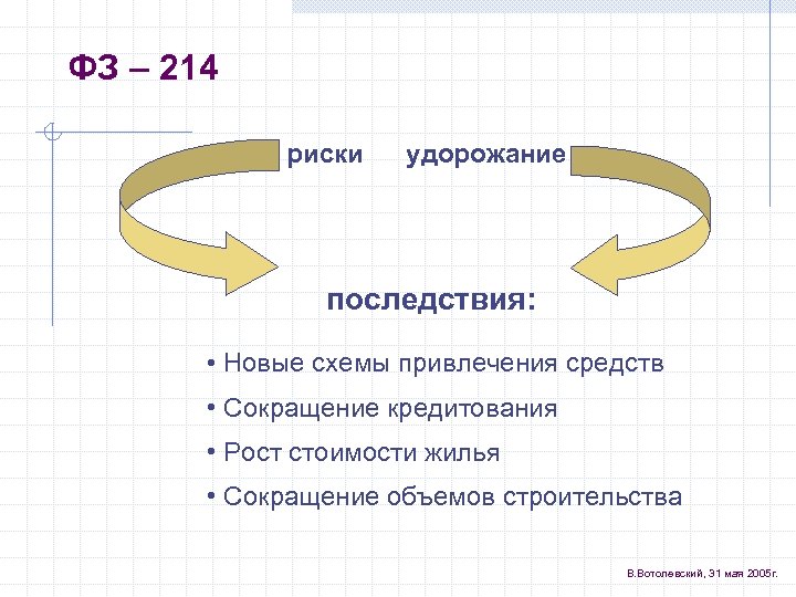 ФЗ – 214 риски удорожание последствия: • Новые схемы привлечения средств • Сокращение кредитования • Рост стоимости жилья • Сокращение объемов строительства В. Вотолевский, 31 мая 2005 г.