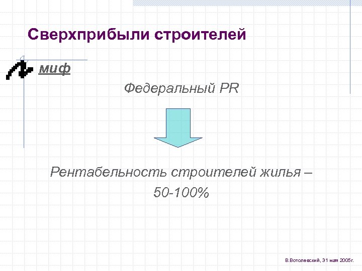 Сверхприбыли строителей миф Федеральный PR Рентабельность строителей жилья – 50 -100% В. Вотолевский, 31 мая 2005 г.
