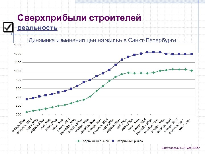 Сверхприбыли строителей реальность Динамика изменения цен на жилье в Санкт-Петербурге 05 05 05 20 20 20 В. Вотолевский, 31 мая 2005 г.