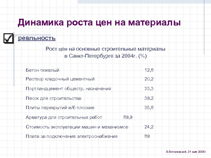 Динамика роста цен на материалы реальность Рост цен на основные строительные материалы в Санкт-Петербурге за 2004 г. (%) Бетон тяжелый 12, 8 Раствор кладочный цементный 20, 2 Портландцемент общестр. назначения 33, 3 Песок для строительства 39, 2 Плиты перекрытий ж/б плоские 35, 8 Арматура для строительных работ 89, 9 Стоимость эксплуатации машин и механизмов 24, 2 Плата за подключение электроснабжения 89 В. Вотолевский, 31 мая 2005 г.