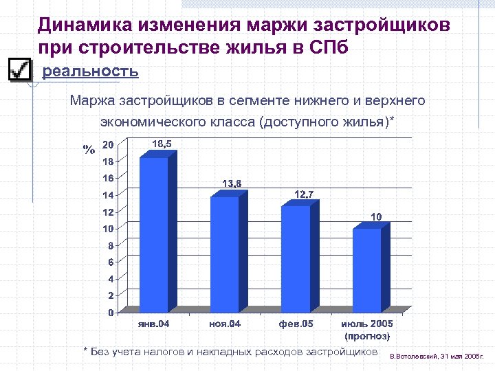 Динамика изменения маржи застройщиков при строительстве жилья в СПб реальность Маржа застройщиков в сегменте нижнего и верхнего экономического класса (доступного жилья)* * Без учета налогов и накладных расходов застройщиков В. Вотолевский, 31 мая 2005 г.