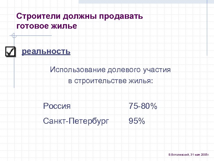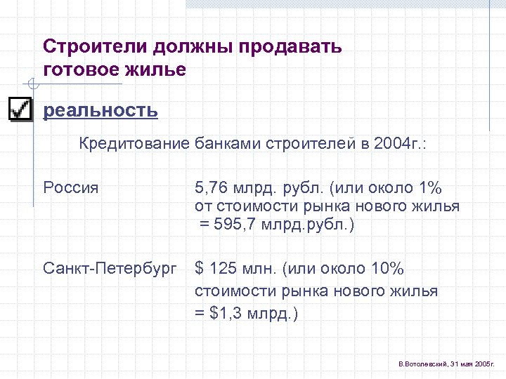 Строители должны продавать готовое жилье реальность Кредитование банками строителей в 2004 г. : Россия 5, 76 млрд. рубл. (или около 1% от стоимости рынка нового жилья = 595, 7 млрд. рубл. ) Санкт-Петербург $ 125 млн. (или около 10% стоимости рынка нового жилья = $1, 3 млрд. ) В. Вотолевский, 31 мая 2005 г.