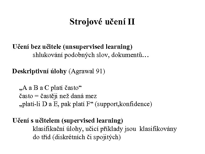 Strojové učení II Učení bez učitele (unsupervised learning) shlukování podobných slov, dokumentů… Deskriptivní úlohy (Agrawal 91) „A a B a C platí často“ často = častěji než daná mez „platí li D a E, pak platí F“ (support, konfidence) Učení s učitelem (supervised learning) klasifikační úlohy, učicí příklady jsou klasifikovány do tříd (diskrétních či spojitých)