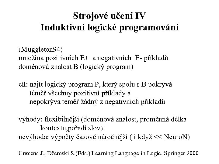 Strojové učení IV Induktivní logické programování (Muggleton 94) množina pozitivních E+ a negativních E příkladů doménová znalost B (logický program) cíl: najít logický program P, který spolu s B pokrývá téměř všechny pozitivní příklady a nepokrývá téměř žádný z negativních příkladů výhody: flexibilnější (doménová znalost, proměnná délka kontextu, pořadí slov) nevýhoda: výpočty časově náročnější ( i když << Neuro. N) Cussens J. , Džeroski S. (Eds. ) Learning Language in Logic, Springer 2000