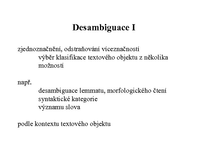 Desambiguace I zjednoznačnění, odstraňování víceznačností výběr klasifikace textového objektu z několika možností např. desambiguace lemmatu, morfologického čtení syntaktické kategorie významu slova podle kontextu textového objektu