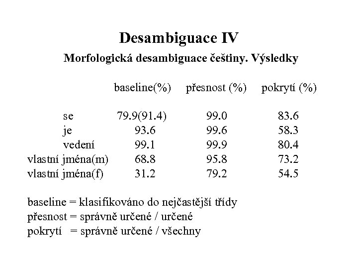 Desambiguace IV Morfologická desambiguace češtiny. Výsledky baseline(%) se 79. 9(91. 4) je 93. 6 vedení 99. 1 vlastní jména(m) 68. 8 vlastní jména(f) 31. 2 přesnost (%) pokrytí (%) 99. 0 99. 6 99. 9 95. 8 79. 2 83. 6 58. 3 80. 4 73. 2 54. 5 baseline = klasifikováno do nejčastější třídy přesnost = správně určené / určené pokrytí = správně určené / všechny