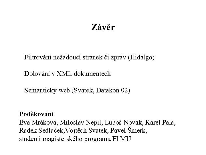 Závěr Filtrování nežádoucí stránek či zpráv (Hidalgo) Dolování v XML dokumentech Sémantický web (Svátek, Datakon 02) Poděkování Eva Mráková, Miloslav Nepil, Luboš Novák, Karel Pala, Radek Sedláček, Vojtěch Svátek, Pavel Šmerk, studenti magisterského programu FI MU