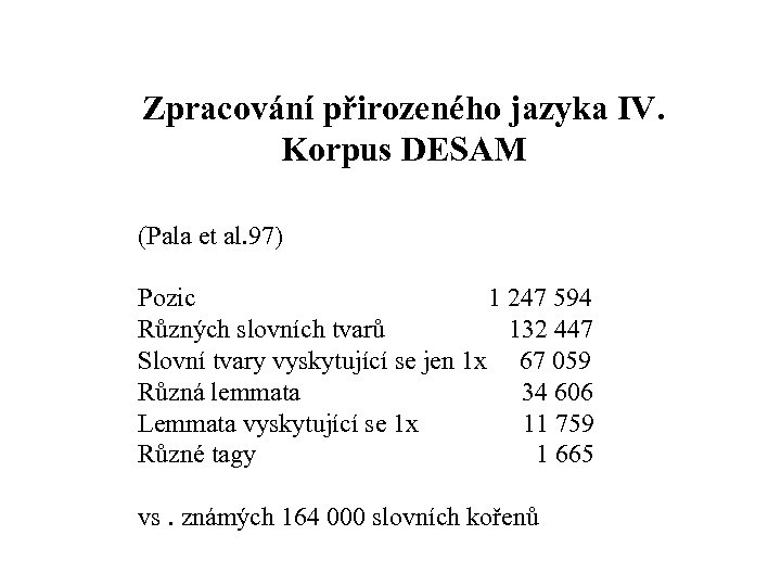 Zpracování přirozeného jazyka IV. Korpus DESAM (Pala et al. 97) Pozic 1 247 594 Různých slovních tvarů 132 447 Slovní tvary vyskytující se jen 1 x 67 059 Různá lemmata 34 606 Lemmata vyskytující se 1 x 11 759 Různé tagy 1 665 vs. známých 164 000 slovních kořenů