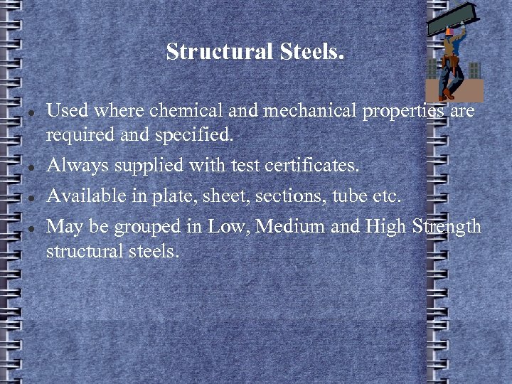 Structural Steels. Used where chemical and mechanical properties are required and specified. Always supplied with test certificates. Available in plate, sheet, sections, tube etc. May be grouped in Low, Medium and High Strength structural steels.