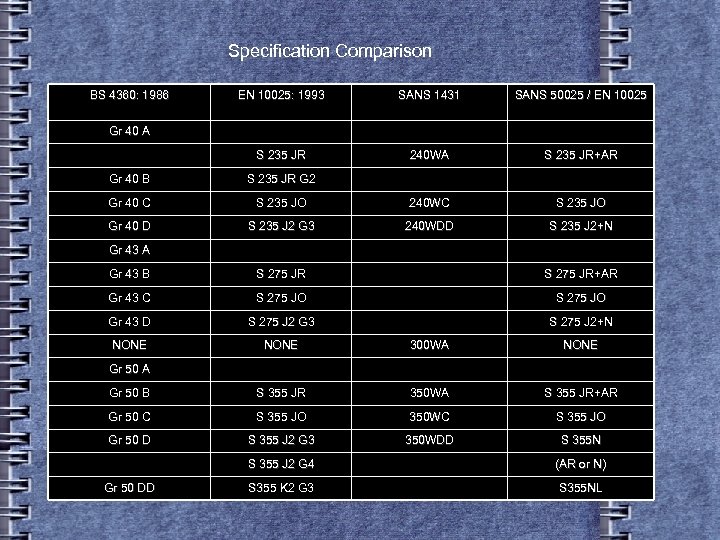 Specification Comparison BS 4360: 1986 EN 10025: 1993 SANS 1431 SANS 50025 / EN 10025 S 235 JR 240 WA S 235 JR+AR Gr 40 A Gr 40 B S 235 JR G 2 Gr 40 C S 235 JO 240 WC S 235 JO Gr 40 D S 235 J 2 G 3 240 WDD S 235 J 2+N Gr 43 A Gr 43 B S 275 JR+AR Gr 43 C S 275 JO Gr 43 D S 275 J 2 G 3 S 275 J 2+N NONE 300 WA NONE Gr 50 B S 355 JR 350 WA S 355 JR+AR Gr 50 C S 355 JO 350 WC S 355 JO Gr 50 D S 355 J 2 G 3 350 WDD S 355 N Gr 50 A S 355 J 2 G 4 Gr 50 DD (AR or N) S 355 K 2 G 3 S 355 NL