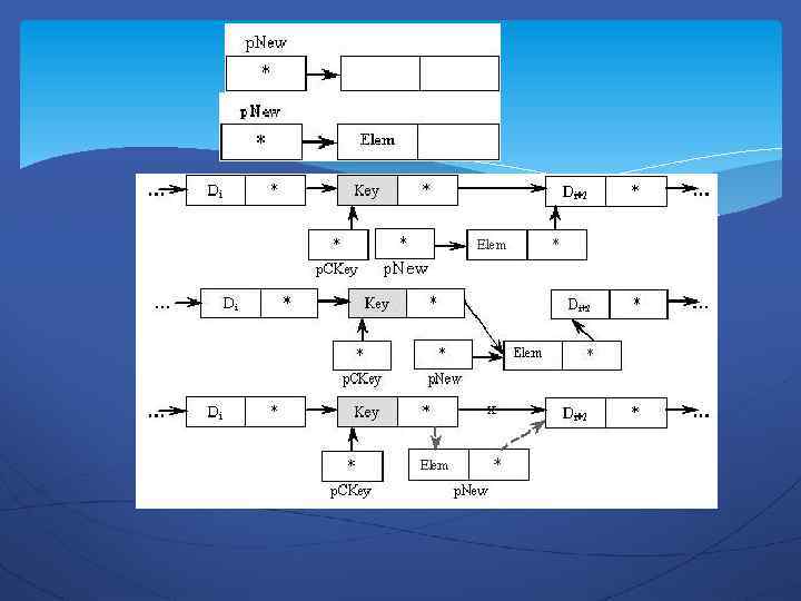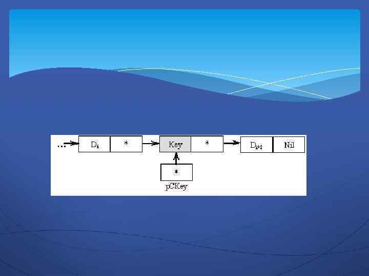 В информационное поле нового объекта p. New помещаем значение информационного поля элемента, на который указывает p. CKey. В поле ссылки на следующий элемент указателя p. New помещаем адрес элемента, следующего за компонентом, на которое указывает p. CKey p. New^. Element : = p. CKey^. Element; p. New^. p. Next : = p. CKey^. p. Next;