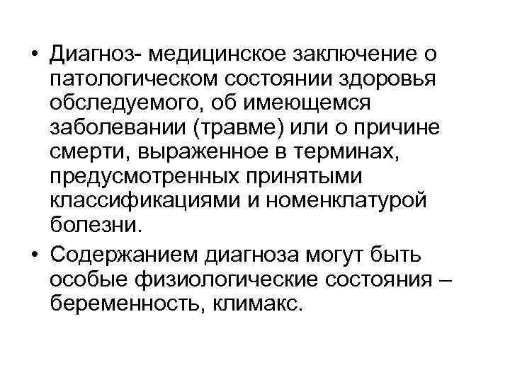 • Диагноз- медицинское заключение о патологическом состоянии здоровья обследуемого, об имеющемся заболевании (травме) или о причине смерти, выраженное в терминах, предусмотренных принятыми классификациями и номенклатурой болезни. • Содержанием диагноза могут быть особые физиологические состояния – беременность, климакс.