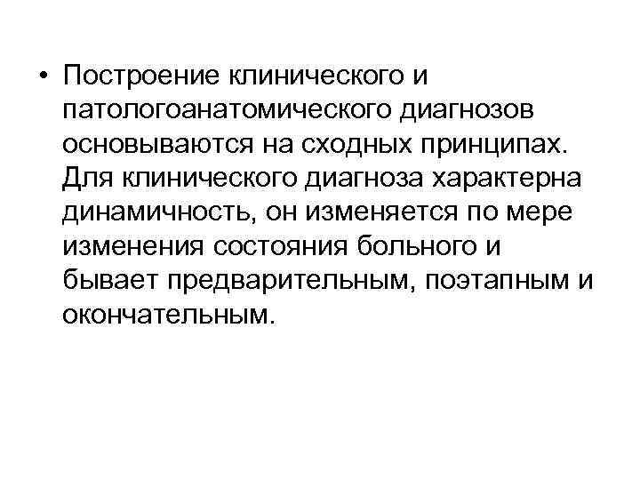 • Построение клинического и патологоанатомического диагнозов основываются на сходных принципах. Для клинического диагноза характерна динамичность, он изменяется по мере изменения состояния больного и бывает предварительным, поэтапным и окончательным.
