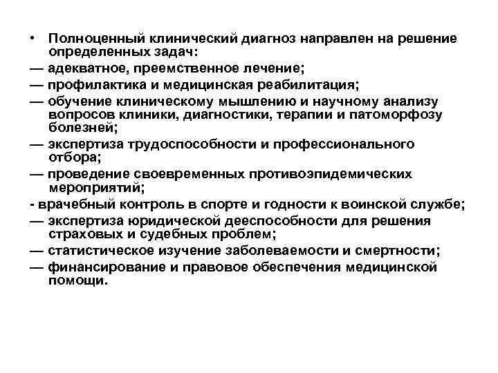 • Полноценный клинический диагноз направлен на решение определенных задач: — адекватное, преемственное лечение; — профилактика и медицинская реабилитация; — обучение клиническому мышлению и научному анализу вопросов клиники, диагностики, терапии и патоморфозу болезней; — экспертиза трудоспособности и профессионального отбора; — проведение своевременных противоэпидемических мероприятий; - врачебный контроль в спорте и годности к воинской службе; — экспертиза юридической дееспособности для решения страховых и судебных проблем; — статистическое изучение заболеваемости и смертности; — финансирование и правовое обеспечения медицинской помощи.