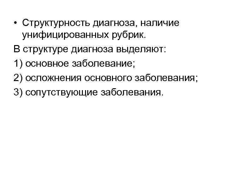 • Структурность диагноза, наличие унифицированных рубрик. В структуре диагноза выделяют: 1) основное заболевание; 2) осложнения основного заболевания; 3) сопутствующие заболевания.