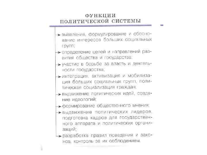Функции политической системы 1. Интеграционная – объединение в целое всех элементов социальной структуры на базе ценностей, идеалов. 2. Целеполагающая – определяет цели и задачи общества. 3. Организаторская – мобилизация ресурсов для достижения установленных целей. 4. Регулятивная – обеспечение общественного признания политики и власти, обеспечения участия граждан в политической жизни. 5. Контролирующая – контроль конфликтов интересов различных социальных групп и социальной целостности общества.