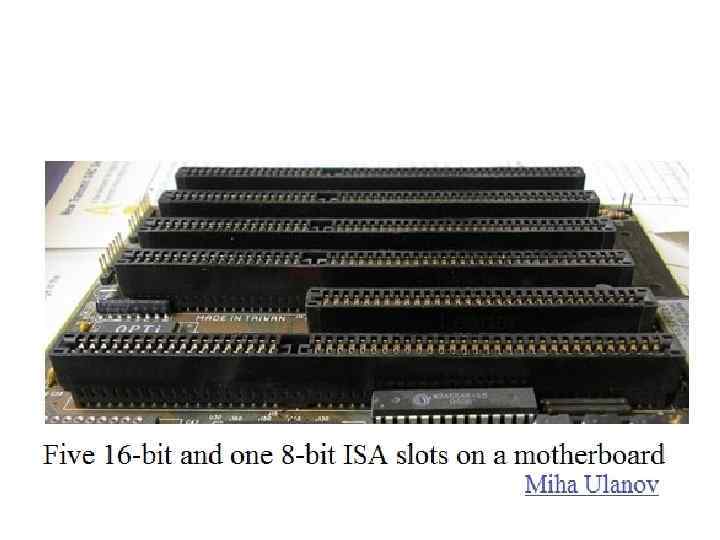 Ширина шины • чем выше пропускная способность шины, ее скорость, чем шире шина данных (чем больше бит данных передается сразу), тем производительней оказывается работа компьютера в целом. Ниже в порядке возрастания скорости передачи данных перечисляются стандарты организации шины: • ISA (Industry Standard Architecture) • EISA (Extended Industry Standard Architecture) MCA (Micro. Channel Architecture) • VLB (Vesa Local Bus) • PCI (Peripheral Component Interconnect)