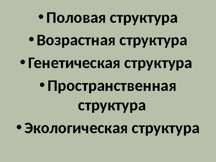 • Половая структура • Возрастная структура • Генетическая структура • Пространственная структура • Экологическая структура