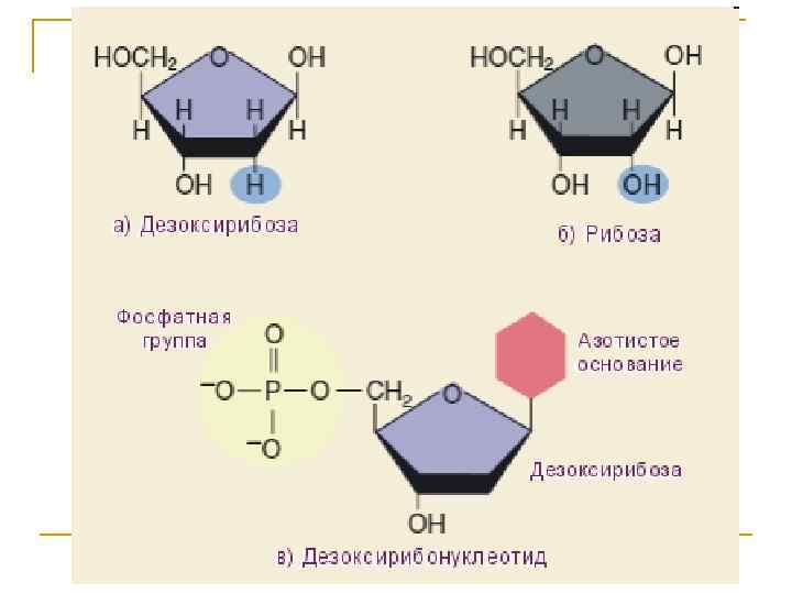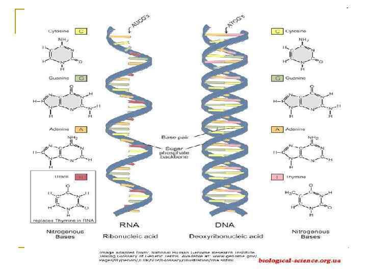 Отличия РНК от ДНК: 1. В состав нуклетидов РНК входит сахар - рибоза; 2. Азотистое основания – урацил, нет тимина; 3. Молекулы РНК обычно представлены одной цепью (у некоторых вирусов РНК двухцепочечная).