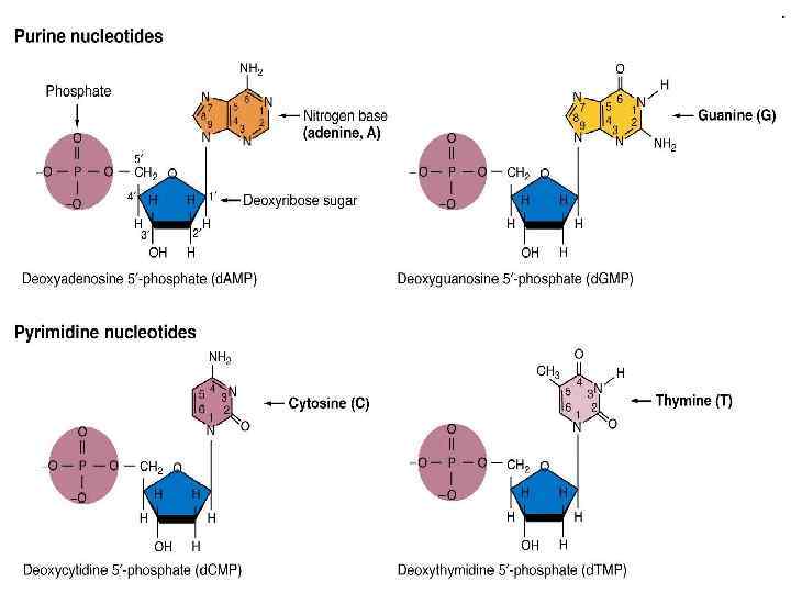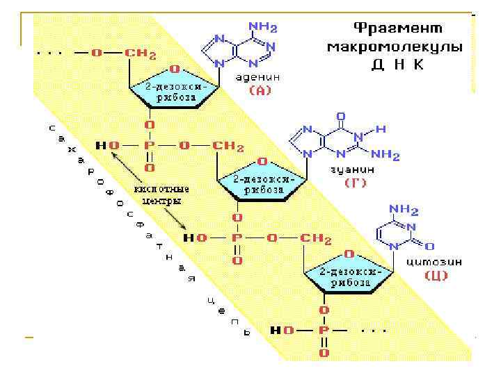 ДНК – это полимер, состоящий из мономеров – нуклеотидов. Каждый нуклеотид включает три основные компонента: 1) азотистое основание (аденин, гуанин, цитозин, тимин); 2) сахар (дезоксирибоза); 3) остаток фосфорной кислоты.
