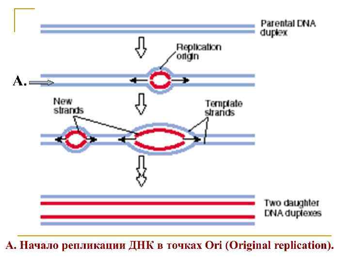 Репликативные вилки движутся в противоположных направлениях от точки начала репликации. Участок ДНК от одной точки Ori до другой называется репликоном.