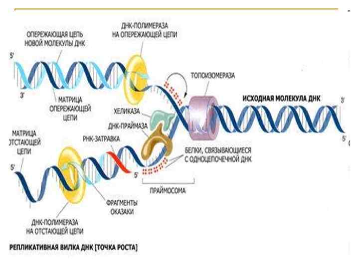 Схема образования "дочерних" цепей ДНК в репликативной вилке. Лидирующая цепь синтезируется непрерывно; отстающая цепь сшивается из фрагментов Оказаки после удаления РНК-затравок и заделывания брешей.