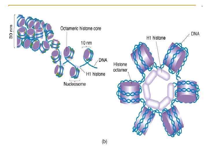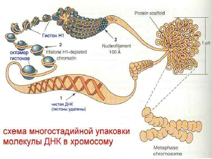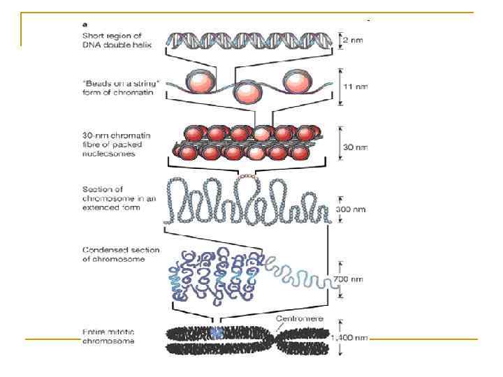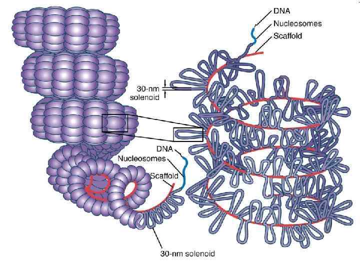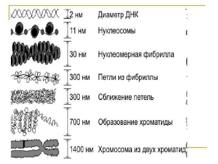 Уровни укладки генетического материала 1. Нуклеосомный 2. Нуклеомерный (супернуклеосомный или соленоидный) 3. Хромомерный (петлевой) 4. Метафазная хромосома.