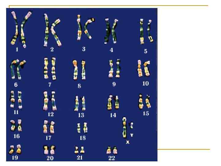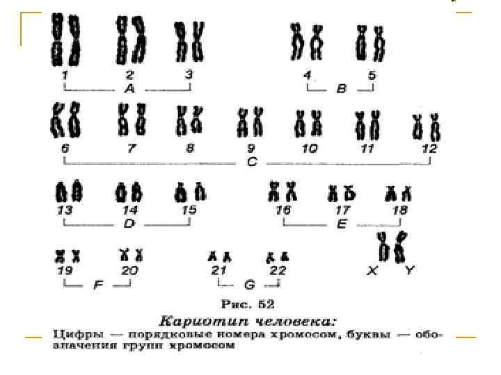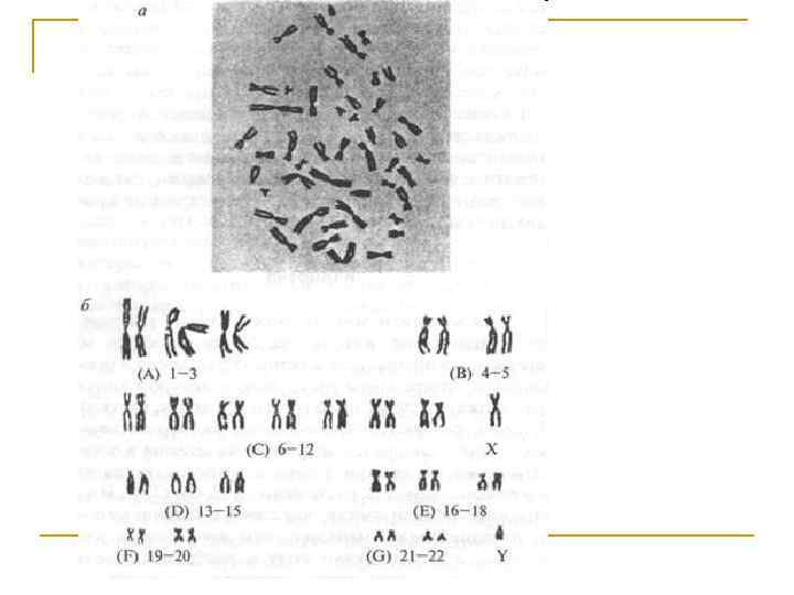 Группа D (13 - 15) – акроцентрические хромосомы. ЦИ около 15%. Группа E (16 - 18) – короткие метацентрические или субметацентрические хромосомы. ЦИ 26 – 40%. Группа F (19 - 20) – две пары маленьких метацентрических хромосом. ЦИ 36 – 46%. Группа G (21 - 22 и Y) – две пары мелких акроцентрических хромосом и Y-хромосома. ЦИ 13 – 33%.