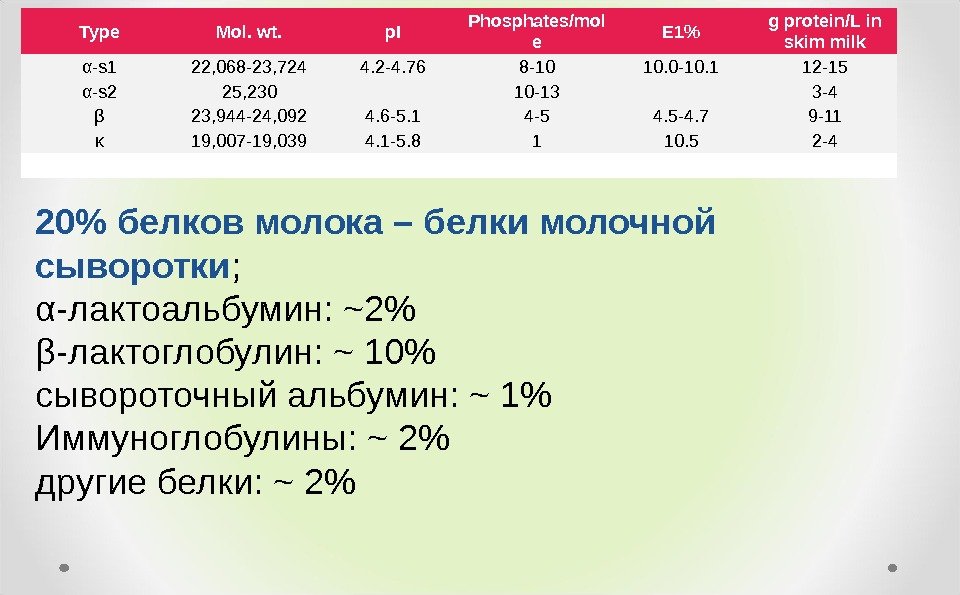 Type Mol. wt. p. I Phosphates/mol e E 1% g protein/L in skim milk α- s 1 22, 068 -23, 724 4. 2 -4. 76 8 -10 10. 0 -10. 1 12 -15 α- s 2 25, 230 10 -13 3 -4 β 23, 944 -24, 092 4. 6 -5. 1 4 -5 4. 5 -4. 7 9 -11 κ 19, 007 -19, 039 4. 1 -5. 8 1 10. 5 2 -4 20% белков молока – белки молочной сыворотки ; α- лактоальбумин : ~2% β- лактоглобулин : ~ 10% сывороточный альбумин : ~ 1% Иммуноглобулины : ~ 2% другие белки : ~ 2%