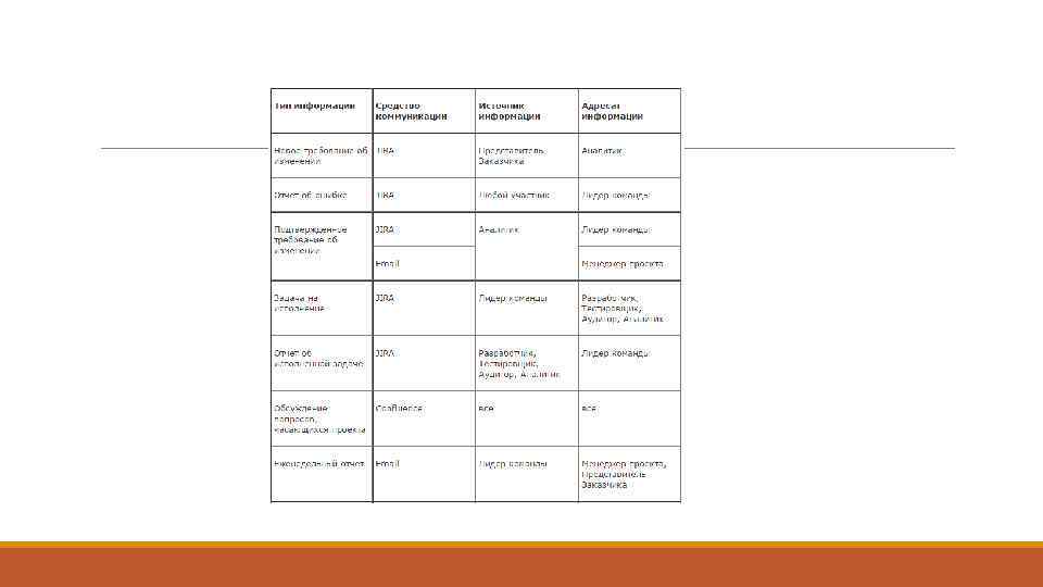 Управление коммуникациями В качестве средств коммуникации в проекте используются следующие: -Система Issue Tracking — JIRA -Система Team Collaboartion (Confluence или любая WIKI-based система) -Электронная почта -Телефон используется в последнюю очередь, в случае необходимости срочного решения какого-либо вопроса.