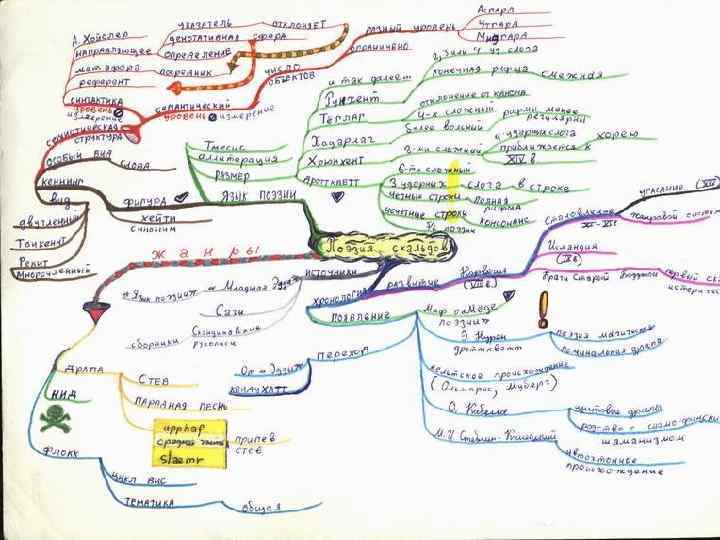 Как составить умственную карту? 5. 6. 7. Ответвления делайте искривленными, а не прямыми. Почему? Ваш мозг гораздо сильнее привлекают искривленные линии, которые вы чаще видите в природе. Пишите по одному слову на строке. Почему? Потому, что каждое отдельное слово или образ генерируют свой собственный огромный массив творческих мыслей. Повсюду используйте образы и изображения. Зачем? Затем, что изображения и символы легко запоминать, они стимулируют новые творческие ассоциации.