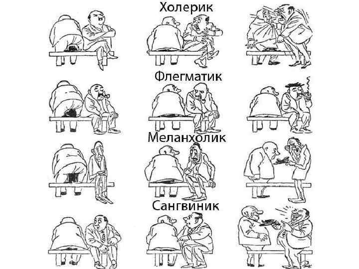 Исторические типы темперамента (по Я. Стреляу) • Флегматик — неспешен, невозмутим, имеет устойчивые стремления и настроение, внешне скуп на проявление эмоций и чувств. Он проявляет упорство и настойчивость в работе, оставаясь спокойным и уравновешенным. В работе он производителен, компенсируя свою неспешность прилежанием. • Холерик — быстрый, порывистый, однако совершенно неуравновешенный, с резко меняющимся настроением с эмоциональными вспышками, быстро истощаемый. У него нет равновесия нервных процессов, это его резко отличает от сангвиника. Холерик обладает огромной работоспособностью, однако, увлекаясь, безалаберно растрачивает свои силы и быстро истощается. • Сангвиник — живой, горячий, подвижный человек, с частой сменой впечатлений, с быстрой реакцией на все события, происходящие вокруг него, довольно легко примиряющийся со своими неудачами и неприятностями. Обычно сангвиник обладает выразительной мимикой. Он очень продуктивен в работе, когда ему интересно, если работа не интересна, он относится к ней безразлично, ему становится скучно. • Меланхолик — склонный к постоянному переживанию различных событий, он остро реагирует на внешние факторы. Свои астенические переживания он зачастую не может сдерживать усилием воли, он повышено впечатлителен, эмоционально раним.