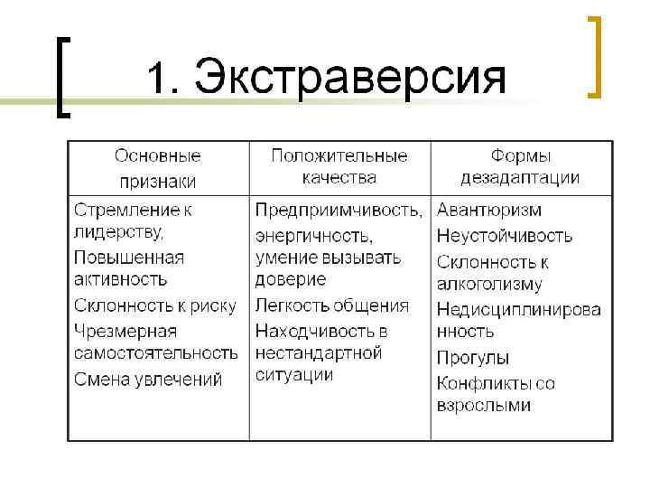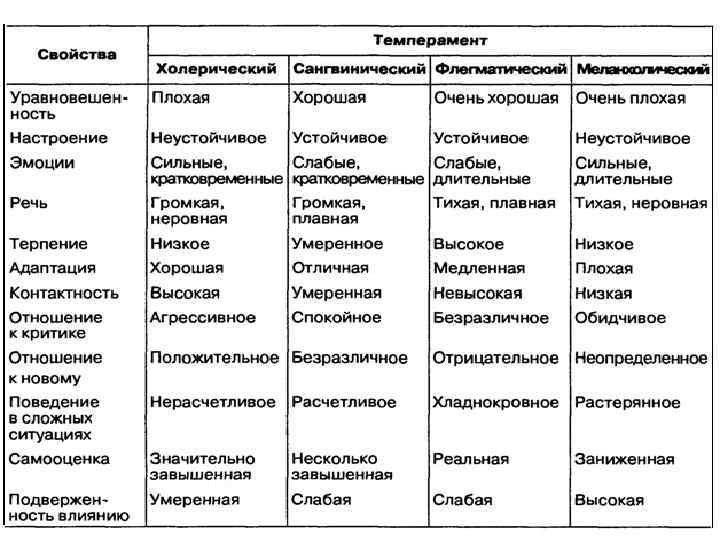 Положительные и отрицательные свойства темперамента • Хорошее воспитание, контроль и самоконтроль даёт возможность проявиться: меланхолику, как человеку впечатлительному с глубокими переживаниями и эмоциями; флегматику, как выдержанному, без скоропалительных решений человеку; сангвинику, как высоко отзывчивому для любой работы человеку; холерику, как страстному, неистовому и активному в работе человеку. • Отрицательные свойства темперамента могут проявиться: у меланхолика — замкнутость и застенчивость; у флегматика — чрезмерная медлительность; у сангвиника — поверхность, разбросанность, непостоянство; у холерика — поспешность решений, раздражительность, агрессивность.