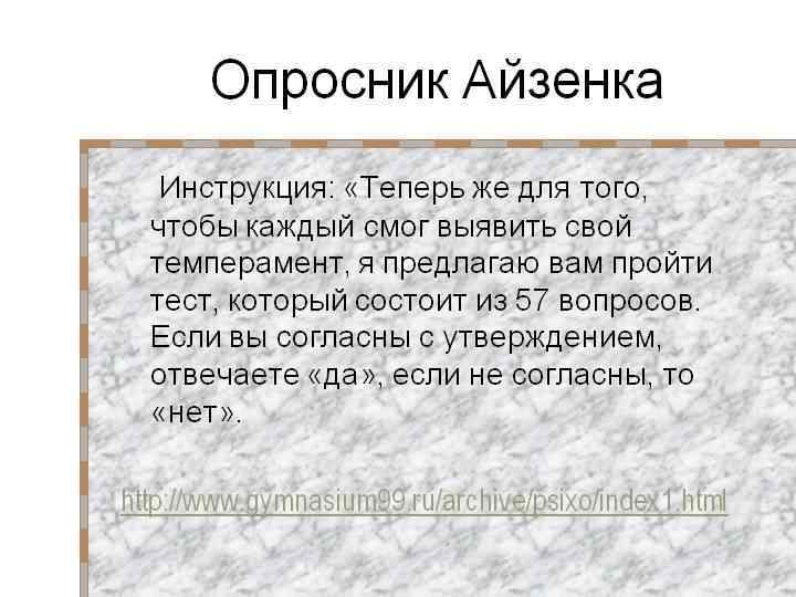Ключ к анализу ответов: шкала "экстpавеpсия": "да" - 1, 3, 8, 10, 13, 17, 22, 25, 27, 39, 44, 46, 49, 53, 56, "нет" - 5, 15, 20, 29, 32, 34, 37, 41, 51. шкала "нейpотизма" "да" - 2, 4, 7, 9, 11, 14, 16, 19, 21, 23, 26, 28, 31, 33, 35, "нет" - 38, 40, 43, 45, 47, 50, 52, 55, 57. шкала "лжи" "да" - 6, 24, 36 "нет" - 12, 18, 30, 42, 48, 54. от 4 и больше баллов – Ваши ответы не достоверны. меньше 4 баллов, Ваши ответы искренни.