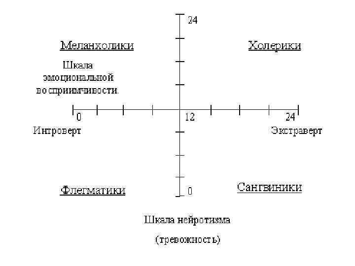 горизонтальная шкала (от 0 - крайняя левая точка – до 24 - правая крайняя точка) - шкала эмоциональной восприимчивости - характеризует уровень общительности человека 2 и менее балла - глубокий интроверт - крайне необщительный, замкнутый человек; 10 и менее, до 2 -х, баллов - интроверт, необщительный, замкнутый человек 11 - 13 баллов - средний уровень общительности, человека не угнетает ни отсутствие общения, ни его избыток; 14 и более баллов - экстраверт, общительный человек вертикальная шкала - шкала нейротизма (тревожности), характеризует эмоциональную устойчивости - неустойчивость человеческой психики норма - 11 - 13 баллов - личность в меру эмоционально устойчива. Раздражители воспринимаются адекватно: надо - тревожится, не надо - не тревожится; 10 и менее баллов - эмоционально неустойчивая личность, тревожится всегда, даже когда не нужно тревожить; 14 и более баллов - эмоционально устойчивый человек вплоть, до эмоциональной холодности.