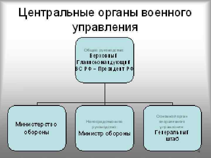 м Непосредственное руководство ВС РФ осуществляет Министр Обороны РФчерез Министерство обороны и Генеральный штаб. Он издает приказы и директивы, вводит в действие правовые акты по различным вопросам деятельности войск.
