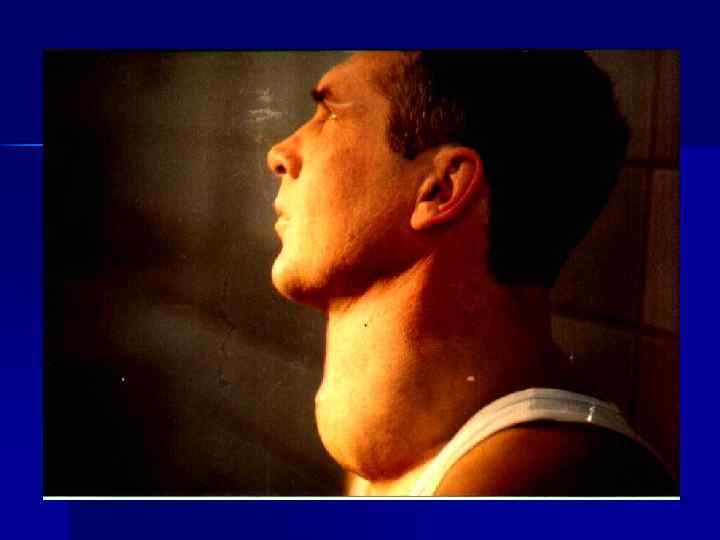 n Увеличение щитовидной железы у больных с диффузным токсическим зобом: увеличение щитовидной железы IV степени (увеличенная железа выходит за пределы грудиноключичнососцевидной мышцы).