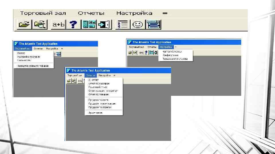 Функциональные возможности Торговый зал Отчеты Настройка Кассир Х-отчет Настройка кассы Настройка торговли Отчет по кассирам Конфигурация Закрытие смены по товарам Почасовой отчёт Пользователи системы Отчет продаж по отделам Отчет по товарам Продажи по кассе Продажи во всем кассам Продажи по отделам Архив чеков