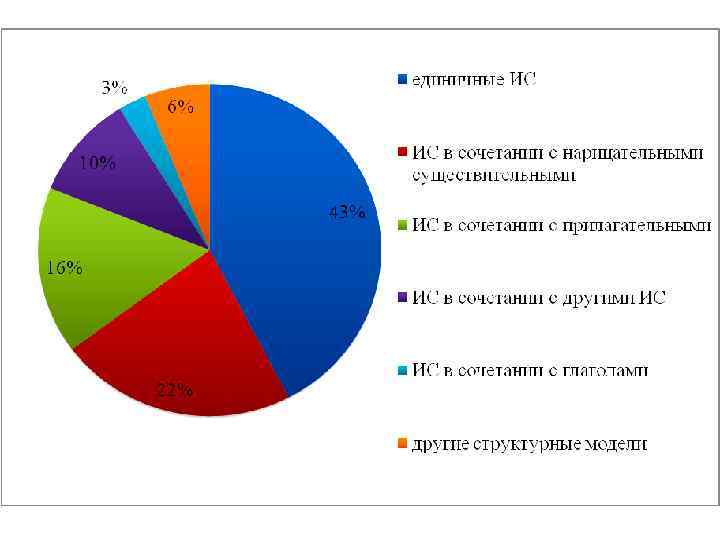 1) 43% (159 единиц) единичные ИС (Newfi; Paddy; Shmoo; Wog 2) 22% (84 единицы) ИС, которые находятся в сочетании с нарицательными существительными (ИС+ нариц. сущ. ) (Baltimor steak; Boston strawberries; Gordon water) 3) 16 % (61 единицы) ИС в сочетании с прилагательными (прил. + ИС) (Cheap John; Golden Bantam; real George; Simple Simon); 4) 10% (38 единицы) ИС в сочетании с другими ИС (ИС+ ИС) (George Eddy; Jimmie Higgins; Mary Warner; Micky Finn; Peter Funk; 5) 3% (10 единиц) ИС в сочетании с глаголами (ИС+(предл. )+глаг. ) (do a Dan O’Leary – усердно работать; John-come-lately – 1. новичок в каком-либо деле; 2. тот, кто опаздывает; 6) 6% (23 единицы) другие структурные модели