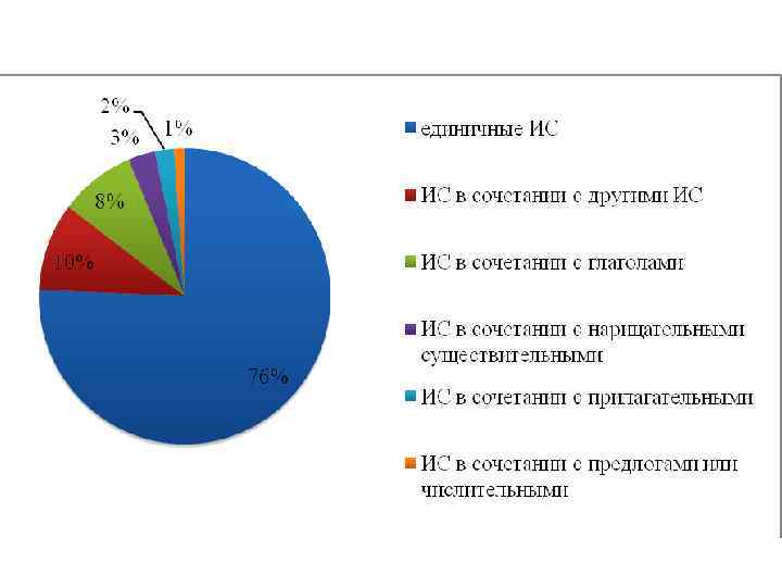 1) 76% (252 единицы) единичные ИС (Акулина – автомат Калашникова; Голливуд – шумная пьянка; Макар – Пол Маккартни); 2) 10% (32 единицы) ИС в сочетании с другими ИС (ИС+ ИС) (Борис Фёдорович – клей; Алла Пугачёва – звуковещательная установка) 3) 8% (28 единиц) ИС в сочетании с глаголами (ИС+ глаг. ) (давить Соньку – спать, дремать; позвонить в Париж – сходить в туалет) 4) 3% (10 единиц) ИС в сочетании с нарицательными существительными (могут использоваться с предлогом) (ИС+нариц. сущ. или ИС+предл. +нариц. сущ. ) (напиток Боткина – алкогольный напиток общепита; Вася из бани – грузинское вино «Вазисубани» ) 5) 2% (7 единиц) ИС в сочетании с прилагательными (прил. + ИС) (Ваня алюминиевый – недалёкий, простой человек; Геракл засушенный – человек, считающий себя физически сильным); 6) 1% (4 единицы) ИС в сочетании с предлогами или числительными (ИС+ предл. / ИС+ (предл. )+ числ. ) (у Катьки – название сквера; на Емелю – на адрес E-mail; две Катьки – двести рублей).