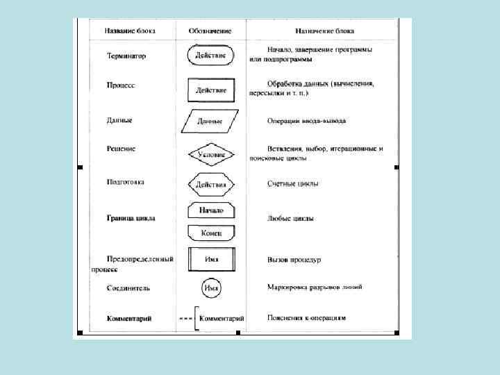 Структурное и «неструктурное» программирование. Средства описания структурных алгоритмов. Линейная структура - для получения результата необходимо выполнить некоторые операции в определенной последовательности. Разветвленная структура - конкретная последовательность операций зависит от значений одной или нескольких переменных. Циклическая структура - для получения результата некоторые действия необходимо выполнить несколько раз. Для изображения схем алгоритмов таких программ разработан ГОСТ 19. 701 -90, согласно которому каждой группе действий ставится в соответствие специальный блок
