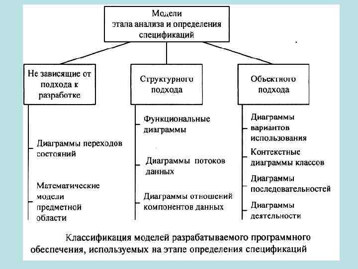 Определение отражает главные требования к спецификациям. Применительно к функциональным спецификациям подразумевается: • требование полноты - спецификации должны содержать всю существенную информацию, где ничего важного не было бы упущено, и отсутствует несущественная информация, например детали реализации; • требование точности - спецификации должны однозначно восприниматься как заказчиком, так и разработчиком. Последнее требование выполнить сложно, так как естественный язык для описания спецификаций не подходит. Спецификации на естественном языке не обеспечивают необходимой точности. Точные спецификации можно определить, только разработав некоторую формальную модель разрабатываемого ПО. Формальные модели, используемые на этапе определения спецификаций разделяют на две группы: - модели, зависящие от подхода к разработке (структурного или объектно-ориентированного), - модели, не зависящие от него.