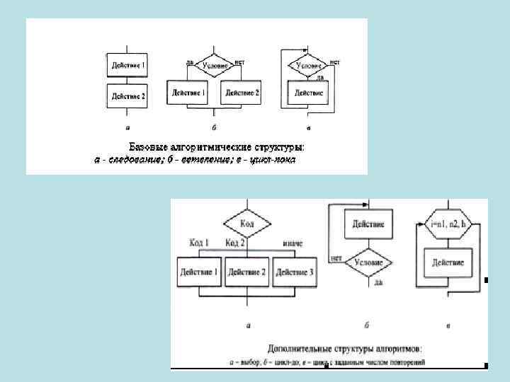В 60 -х годах XX в. было доказано, что любой сколь угодно сложный алгоритм можно представить с использованием трех основных управляющих конструкций. Базовые управляющие конструкции: • следование - последовательное выполнение действий • ветвление - выбор одного из двух вариантов действий • цикл-пока - повторение действий, пока не будет нарушено условие, выполнение которого проверяется в начале цикла Еще три конструкции, которые можно составить из базовых: • выбор - выбор одного варианта из нескольких в зависимости от значения некоторой величины; • цикл-до - повторение некоторых действий до выполнения заданного условия, проверка которого осуществляется после выполнения действий в цикле; • цикл с заданным числом повторений (счетный цикл) повторение некоторых действий указанное количество раз. Любая из дополнительных конструкций легко реализуется через базовые.