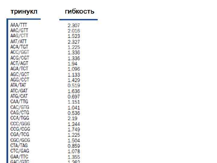 1. Гибкость триплетов ДНК может отличаться в несколько раз 2. Существуют триплеты с близкими значениями гибкости, но различным нуклеотидным составом