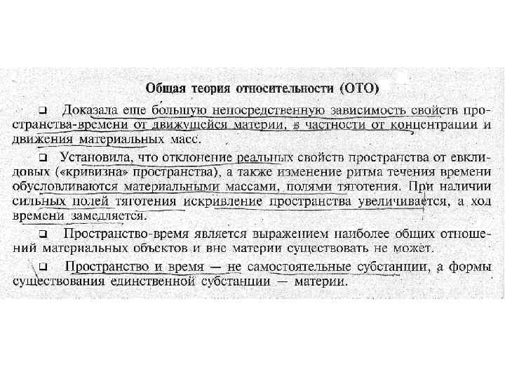 Общая теория относительности (ОТО; нем. allgemeine Relativitätstheorie) - геометрическая теория, развивающая специальную теорию относительности (СТО), опубликованная Альбертом Эйнштейном в 1915 -1916 годах. В рамках общей теории относительности постулируется, что гравитационные эффекты обусловлены не силовым взаимодействием тел и полей, находящихся в пространстве-времени, а деформацией самого пространства-времени, которая связана, в частности, с присутствием массы-энергии. Таким образом, в ОТО, как и в других метрических теориях, гравитация не является силовым взаимодействием. Общая теория относительности отличается от других метрических теорий тяготения использованием уравнений Эйнштейна для связи кривизны пространствавремени с присутствующей в пространстве материей.