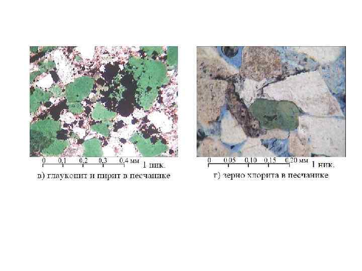 Минеральный состав цементов Глауконит Легко узнается в шлифах по зеленому или буро-зеленому цвету разной интенсивности, по показателю преломления большему, чем у канадского бальзама, по цветам интерференции, совпадающим с его собственным (зеленым) цветом, по микроагрегатному строению. В породах встречается в виде обломочных зерен, в виде тонкорассеянного вещества, в цементе, порах, остатках организмов. Хлориты Обладают зеленой или слабо-зеленой окраской, иногда бесцветны, обычен слабый плеохроизм, который усиливается с увеличением интенсивности окраски. Показатели преломления хлоритов выше показателя преломления канадского бальзама. Характерным признаком являются низкие цвета интерференции в темно-серых тонах при собственной зеленой окраске. Многие хлориты имеют аномальные цвета интерференции. Цеолиты В шлифах бесцветны. В крупных кристаллах легко определяются по очень низкому двупреломлению (<1, 50) и очень низкому светопреломлению (до 0). Присутствуют в качестве аутигенных в цементе и обломочных зернах, которые замещают.