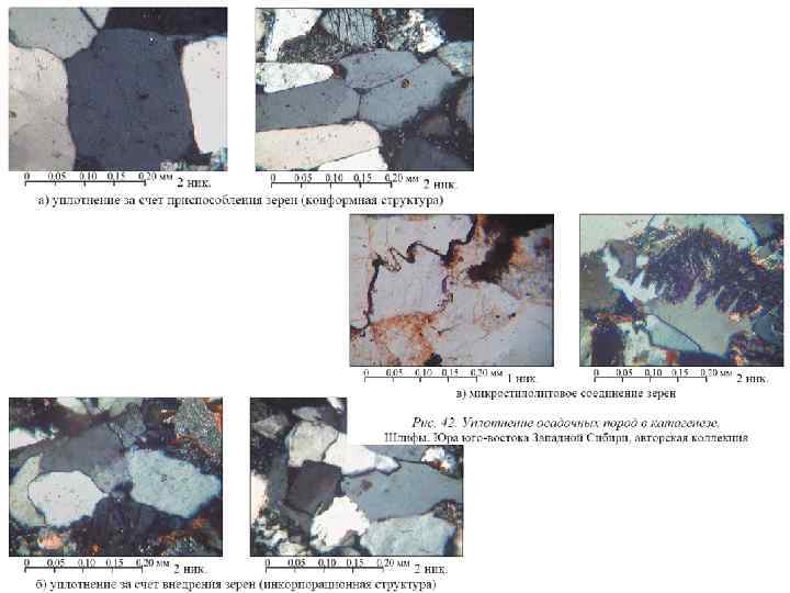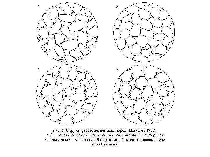 По взаимоотношению с обломочными зернами. В. Деструктивные цементы: 5) Проникновения. Осуществляются по трещинам разрыва или спайности в трещиноватых обломках 6) Коррозионный. Характеризуется проникновением и частичным замещением любых обломочных зерен веществом цемента. 7) Замещения А. Независимой цементацией называется явление, когда вещество цемента не ориентируется каким-либо образом и не взаимодействует с веществом обломочных пород. Б. Конструктивные цементы (рис. 1 -4) наращивают зерна, увеличивая их размеры. Различают конструктивные цементы четырех типов. 1) Пленочный. Обволакивает обломки тонкой аморфной пленкой. Пленочными чаще всего являются глинистый, железистый и фосфатный цементы, образующиеся в зоне выветривания материнских пород, при переносе и отложении, реже в раннем диагенезе. 2) Крустификационный (или обрастания). Характеризуется развитием кристалликов цемента, ориентированных перпендикулярно к поверхности обломочных частиц и образующих вокруг них непрерывную оторочку. 3) Неравномерного нарастания. Возникает вследствие роста кристаллов в направлении, перпендикулярном давлению - образование «бородатых зерен» . Развивается по кварцу, альбиту и некоторым тяжелым минералам. 4) Регенерационный. Проявляется в наращивании обломков цементом того же состава с той же оптической ориентацией, что под микроскопом проявляется в одновременном погасании и просветлении обломочного зерна и регенерационной каймы.