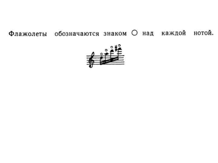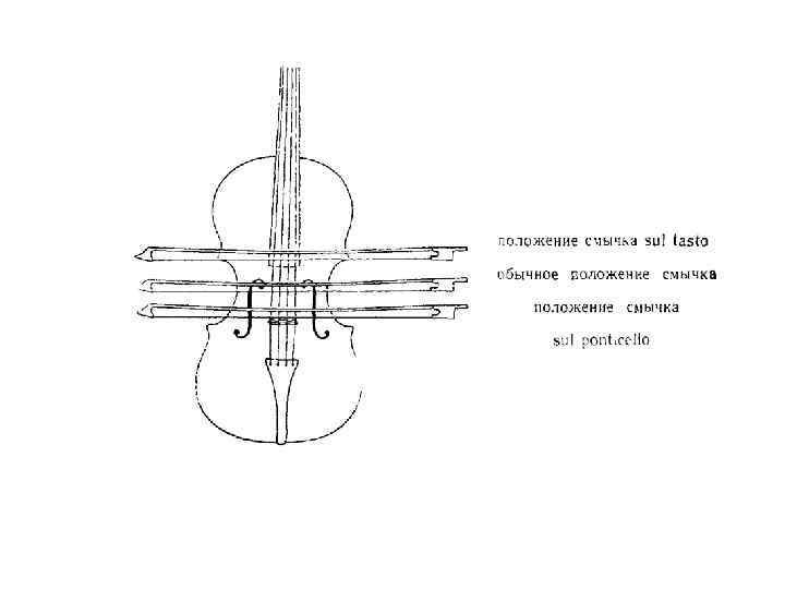 Особые эффекты • sul ponticello (суль понтичелло) - ведение смычка у подставки • sul tasto (суль тасто) – ведение смычка на грифе • col legno (кол легно) - постукивание тростью (древком) смычка по струне • сon sordino - «с сурдиной» (отмена сурдин - senza sord. ) • флажолеты – призвуки, искусственно получаемые легким прикосновением пальца (обертоны)