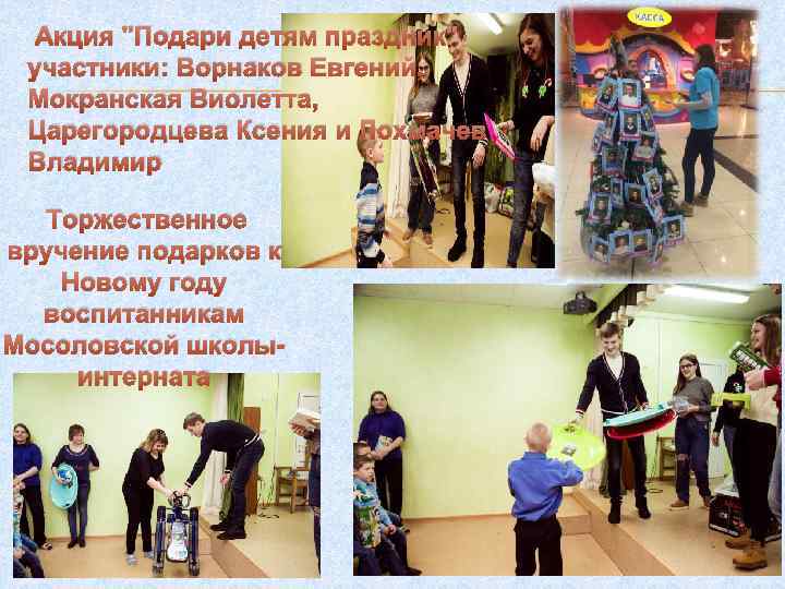 Акция "Подари детям праздник" участники: Ворнаков Евгений, Мокранская Виолетта, Царегородцева Ксения и Лохмачев Владимир Торжественное вручение подарков к Новому году воспитанникам Мосоловской школы- интерната